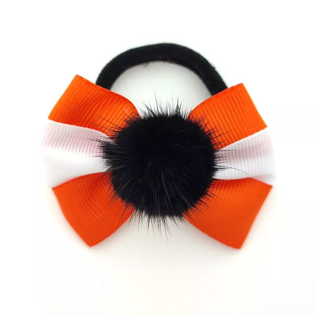Laço modelo Lavínia em sobreposição de fita de gorgurão com aplique de pompom pelúcia na área central.