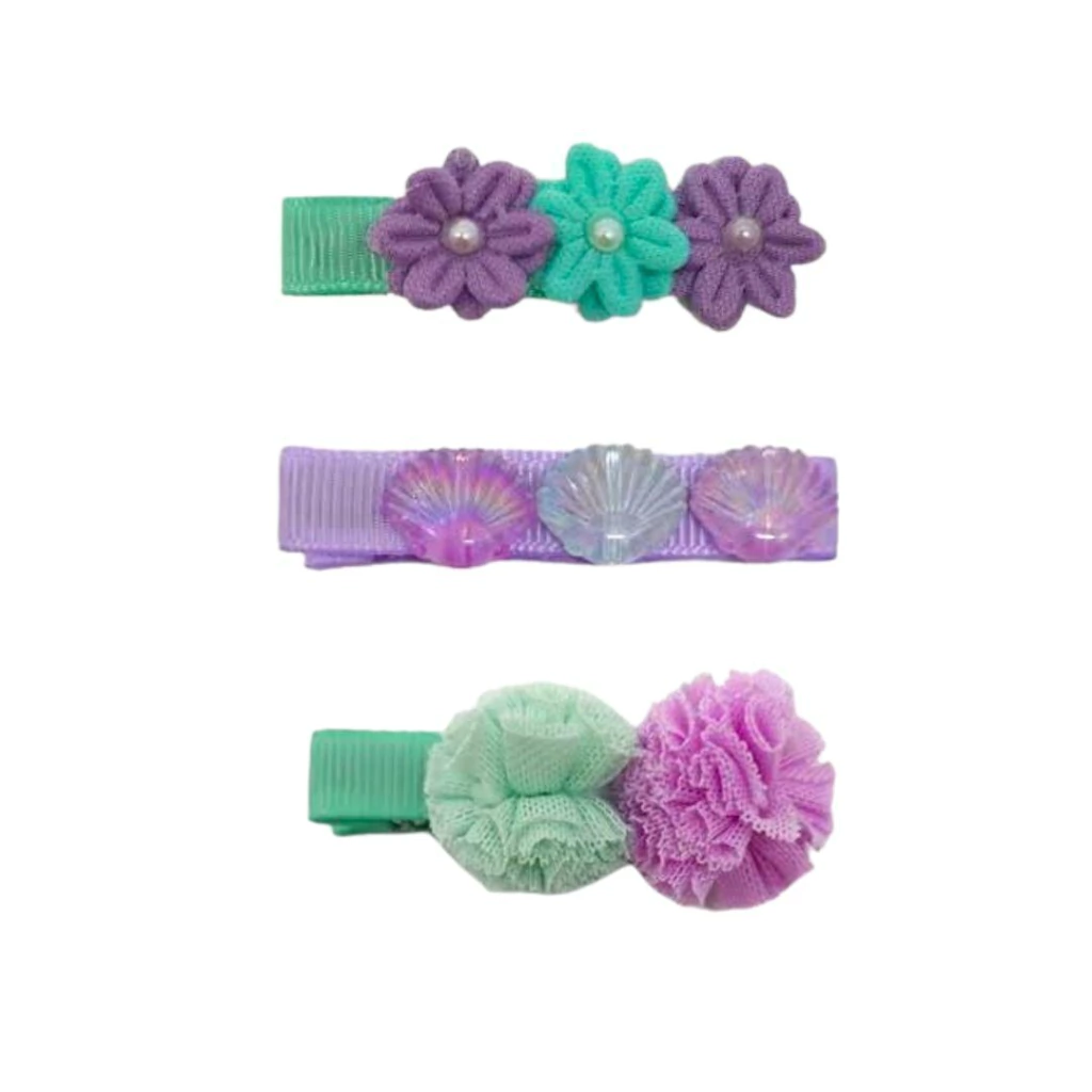 Encante-se com este kit inspirado na delicadeza do fundo do mar! Com 3 presilhas e 2 laços nas cores lilás e verde água, ele traz o charme das conchas e o frescor das ondas para o visual da sua pequena.