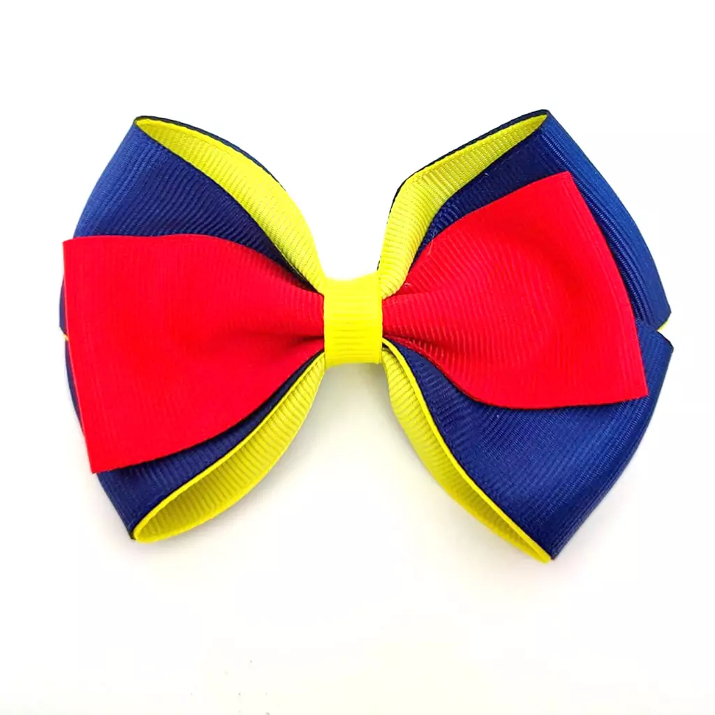 Laço em estilo sobreposição de fitas, um formado delicado que deixa um detalhe lindo no penteado e pompom de pelúcia no centro.