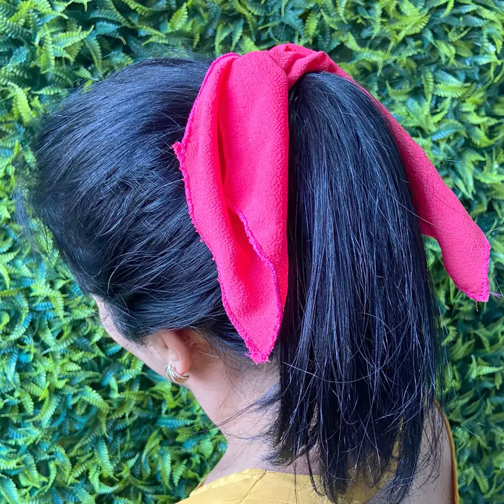 Detalhes do produto: Elástico confortável para cabelos com lenço alongado nas pontas, de aproximadamente 15cm.