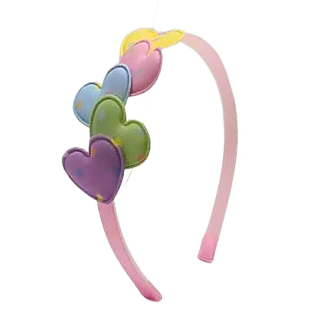Tiara infantil na cor rosa claro, confeccionada com acabamento confortável e adornada com corações em tons candy. Ideal para uso diário ou ocasiões especiais, proporcionando charme e delicadeza ao visual das pequenas.