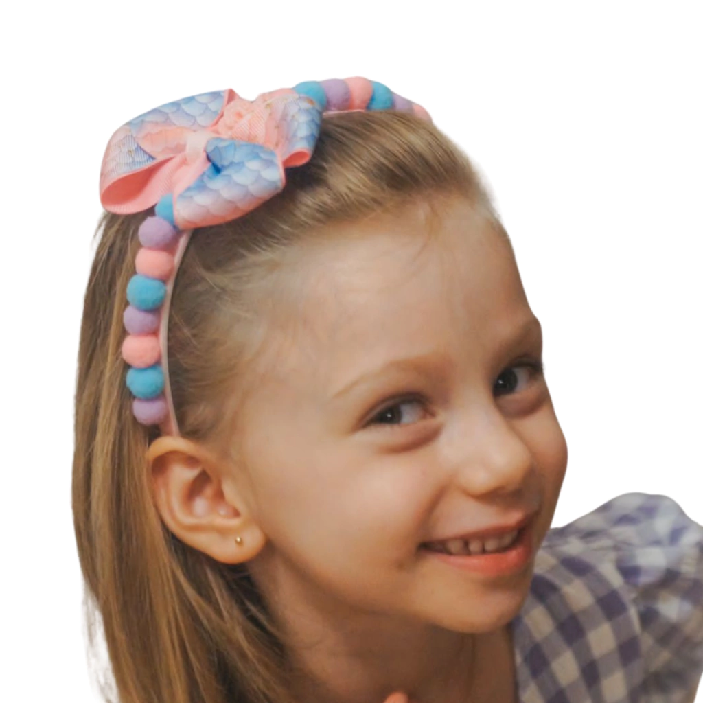Tiara de Sereia, uma grande tendência de fantasia. Ela vem no arco de plastico branco com dentes, envolvida por uma fita de cetim e pompons fofos. E um laço com estampa de sereia Produto 100% artesanal e montagem manual. A cor da cauda pode variar.