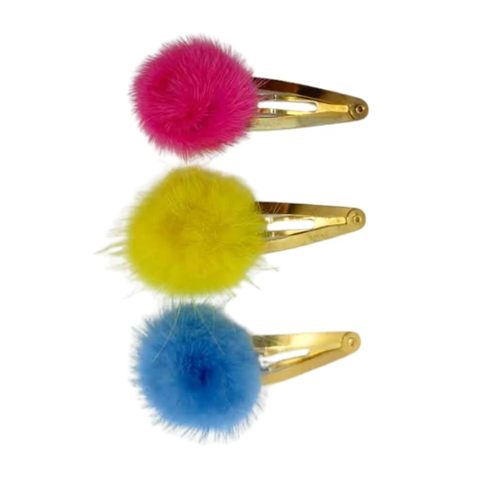 Um toque de fofura para qualquer look! Esse trio vem com tic tacs delicados, cada um com um pompom macio e charmoso nas cores rosa pink, azul e amarelo.